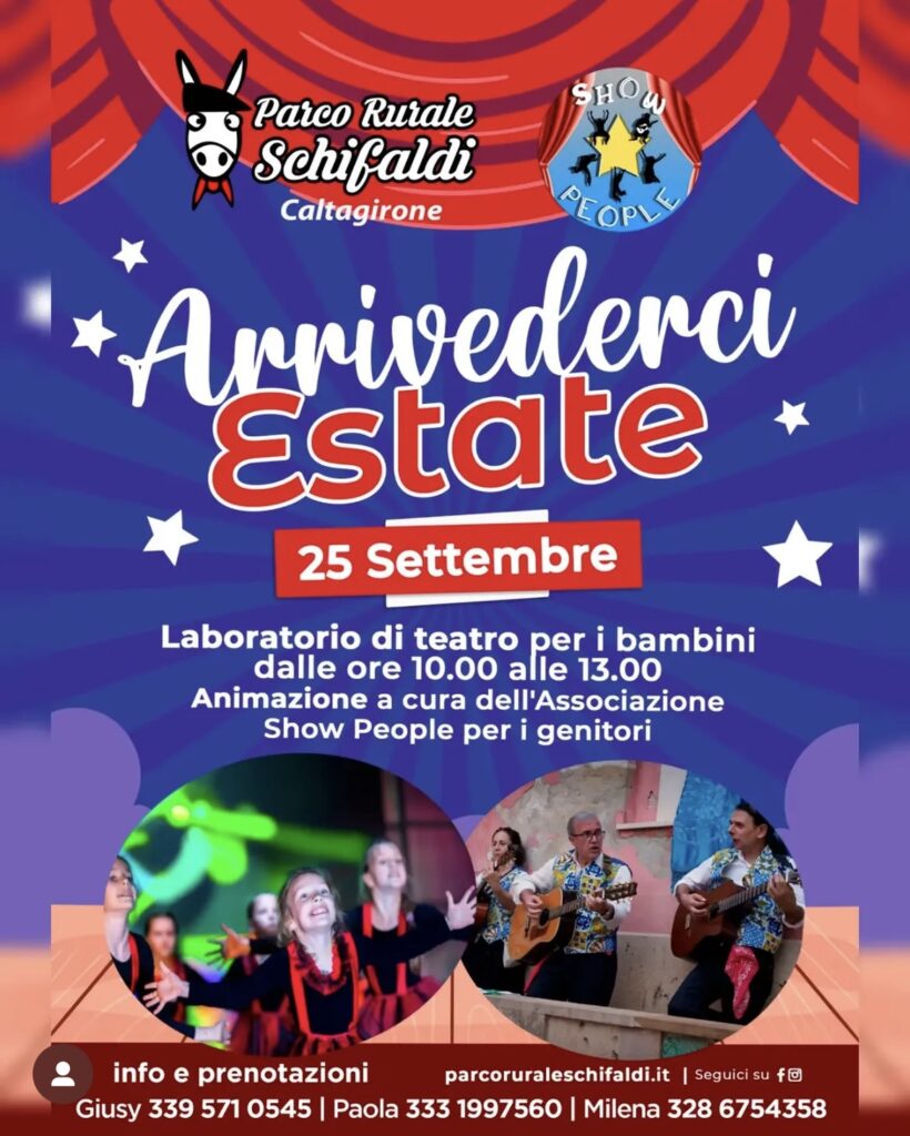 “ARRIVEDERCI ESTATE”, iniziativa dell’Associazione Culturale Show People in collaborazione con il Parco Rurale Schifaldi. Giornata dedicata all’intrattenimento e alla musica popolare, con laboratorio teatrale per bambini finalizzato alla scoperta del linguaggio teatrale e alla socializzazione attraverso giochi ed esercizi. Spazi del Parco Schifaldi attrezzati con servizio, area dedicata e campo per attività sportive. Partecipazione su prenotazione, con attività a numero limitato.